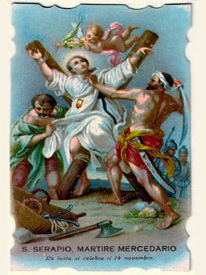 Al rientro a Londra, dopo essere stato assalito dai corsari che lo lasciarono mezzo morto sulla spiaggia, fu liberato da monaci-cavalieri, conquistatori delle Baleari. Serapio se ne dovette allontanare per contrasti con il sovrano, dirigendosi poi in Africa dove trovò la morte: legato alla croce di Sant’Andrea, decapitato mentre si adoperava per convertire i suoi carcerieri.