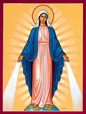 La medaglia miracolosa fu il dono che la Madonna volle fare a santa Caterina Labourè il 27 novembre 1830: la Vergine le apparve in una vigilia di Avvento in abito bianco di seta, con in mano il mondo, all’altezza del cuore, racchiuso in una cornice ovale a mò di medaglia, contornata da una scritta in lettere d’oro: “O Maria concepita senza peccato. Pregate per noi che ricorriamo a voi”. La cornice ruotò poi su se stessa, comparve la lettera M sormontata da una croce e, sotto, da due cuori (l’uno coronato di spine e l’altro trafitto da una spada).